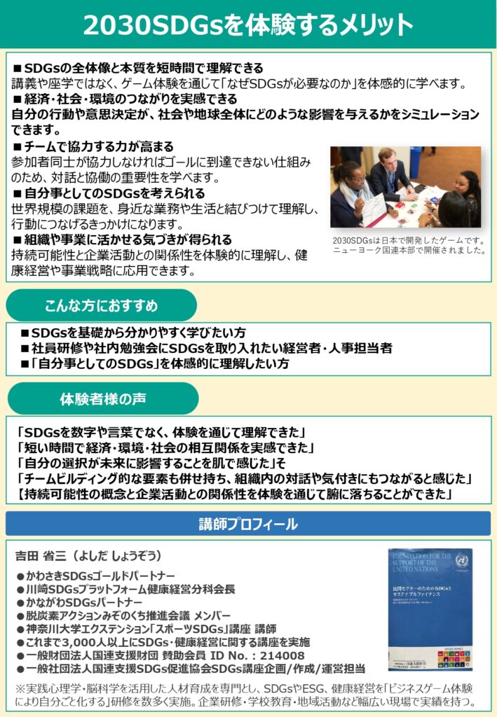 2025年08月22日 お知らせ ワークショップ SDGs 研修・コーチング ブログ SDGsの本質を理解するビジネスゲーム講座 川崎市SDGsプラットフォーム 「健康経営を探求し構想し実現を目指す分科会」主催イベント 今回の健康経営分科会では、SDGsの本質を体感的に理解できるビジネスゲーム『2030SDGs』を行います。健康経営を含むさまざまな取組みを、より広い視野で捉えるきっかけとなります。 ご興味・ご関心のある方は、どなたでもお申し込み、ご参加いただけます。ご質問などございましたら、下記申込先の電話・メールまでお気軽にお問い合わせください。 記事一覧に戻る